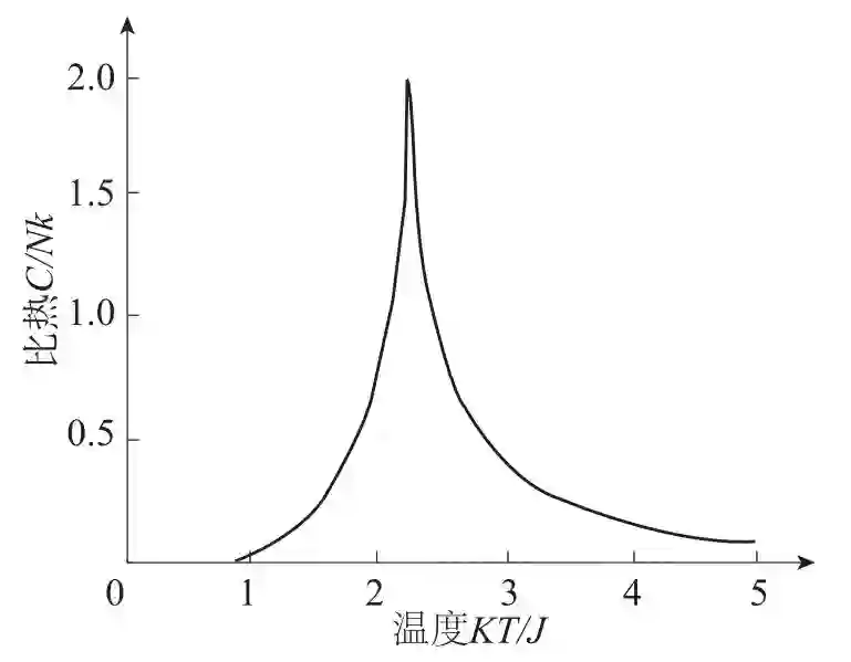 的手续并不简单。 伊辛本人只解决了一维链 (即磁矩排列成一条直线) 的情形, 发现没有相变。 他还给出一些似是而非的论据, 说明二维和三维情形下也不会有相变。 直到1944年昂萨格 ( L.Onsager) 以精美的数学技巧解出了二维伊辛模型, 人们才明白二维是有相变的, 但比热尖峰 (图2) 只有在取了热力学极限之后才突出起来。 这是平衡态统计物理的一项辉煌成就, 是后来授予昂萨格诺贝尔奖奖金的根据之一(注[1])。 杨振宁对于二维伊辛模型也做过重要贡献。 然而半个多世纪以来一直未能严格计算出更为实际的三维伊辛模型, 甚至连解决途径也不清楚。