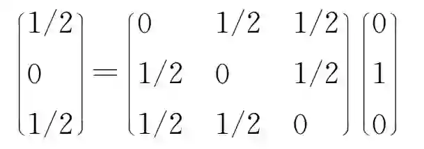三种可能的初始状态, 即粒子处于第1、2或 3点上, 可以用三个矢量(1,0,0)、(0, 1, 0)、(0, 0, 1)代表。 如果粒子现在处于某点, 则一次跳跃后它必定离开此点, 以各为1/2 的概率达到另外两点之一。 新的状态可以用一个方阵 ( “转移矩阵”) 乘代表初始状态的矢量来得到。 例如