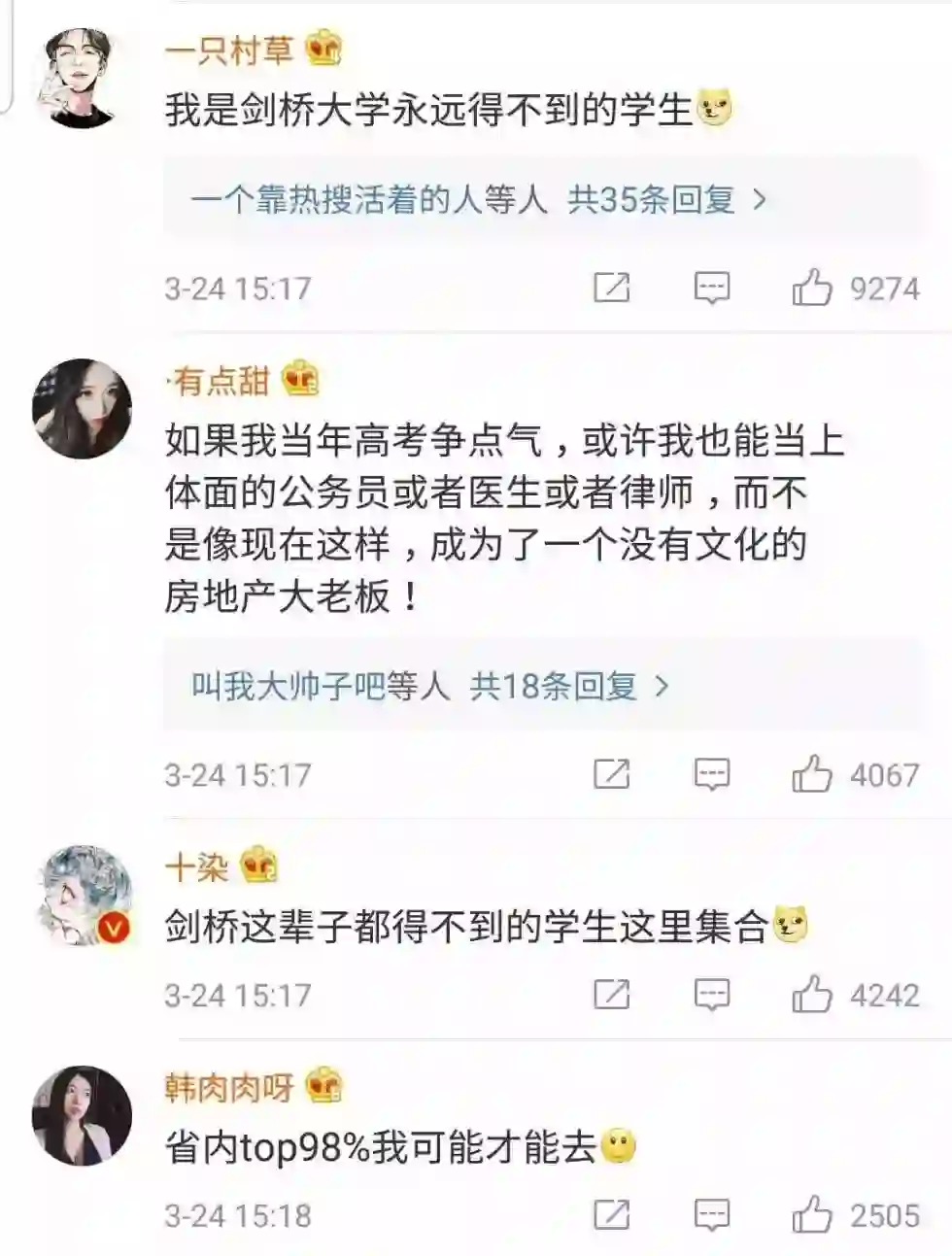 也有不少“柠檬精”网友表示,他们是剑桥永远得不到的学生,面对现实,保持清醒——