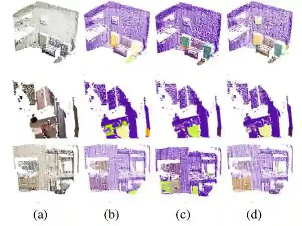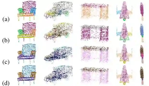 图6:(a)实例分割的真实结果,(b)SGPN的实例分割结果,(c)PointNet++的语义分割结果,(d)SGPN的语义分割结果。