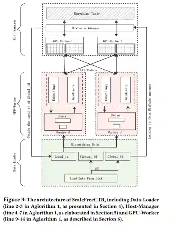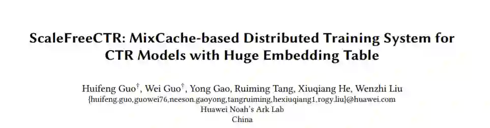 本文将介绍华为诺亚推荐搜索与AI系统工程联合团队最新发表在SIGIR2021上的研究成果:ScaleFreeCTR: MixCache-based Distributed Training System for CTR Models with Huge Embedding Table。ScaleFreeCTR针对超大规模Embedding的深度推荐模型,提出CPU-GPU协同训练系统,通过自研的MixCache缓存机制和高效的流水线设计,实现CPU-GPU数据传输延迟的降低,提升了并行效率。同等硬件下,训练性能超过HugeCTR的5倍,目前已在华为多个业务场景中应用,ScaleFreeCTR近期将在华为深度学习框架MindSpore进行开源。