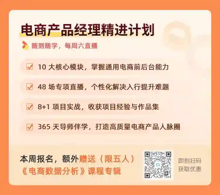 起点课堂联合2位大厂电商产品经理+产品总监,帮助0-3岁电商产品经理,系统构建行业规范的电商产品能力框架,成为大厂认可的电商产品经理!