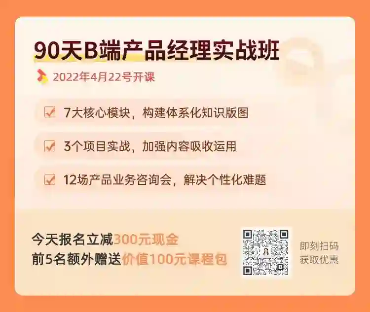 向你推荐《90天B端产品经理实战班》,带你掌握系统的B端产品工作方法,助你顺利转岗&提升专业能力,实现涨薪小目标。