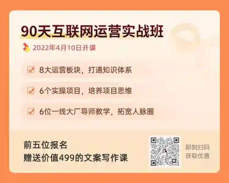 给大家推荐《90天互联网运营实战班》,由腾讯课堂与起点课堂联合创办,专门针对0-3岁运营人的能力提升课,内容对标腾讯P6-P8级运营人能力模型!让你胜任未来1-2年的运营工作~