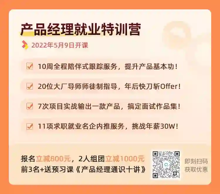 为帮助大家10周斩获产品Offer,胜任初级产品岗,特训营以BAT级大厂能力模型为蓝本,将系统基础课程+就业求职指导结合,目前已有2000+位学员,通过我们的求职辅导名企内推成功就业!