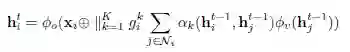 门控注意力网络(GAAN)还采用了多头注意力机制来更新节点的隐藏状态。然而,GAAN并没有给每个head部分配相等的权重,而是引入了一种自注意机制,该机制为每个head计算不同的权重。更新规则定义为,