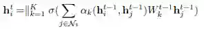 其中α(·)是一个注意力函数,它自适应地控制相邻节点j对节点i的贡献。为了学习不同子空间中的注意力权重,GAT还可以使用多注意力: