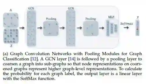 GCN方法又可以分为两大类,基于频谱(spectral-based)和基于空间(spatial-based)。基于频谱的方法从图信号处理的角度引入滤波器来定义图卷积,其中图卷积操作被解释为从图信号中去除噪声。基于空间的方法将图卷积表示为从邻域聚合特征信息,当图卷积网络的算法在节点层次运行时,图池化模块可以与图卷积层交错,将图粗化为高级子结构。如下图所示,这种架构设计可用于提取图的各级表示和执行图分类任务。