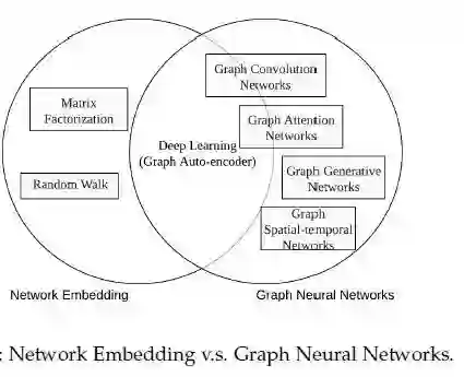 需要注意的是,图神经网络的研究与图嵌入(对图嵌入不了解的读者可以参考我的这篇文章《图嵌入综述》)或网络嵌入密切相关,图嵌入或网络嵌入是数据挖掘和机器学习界日益关注的另一个课题。图嵌入旨在通过保留图的网络拓扑结构和节点内容信息,将图中顶点表示为低维向量空间,以便使用简单的机器学习算法(例如,支持向量机分类)进行处理。许多图嵌入算法通常是无监督的算法,它们可以大致可以划分为三个类别,即矩阵分解、随机游走和深度学习方法。同时图嵌入的深度学习方法也属于图神经网络,包括基于图自动编码器的算法(如DNGR和SDNE)和无监督训练的图卷积神经网络(如GraphSage)。下图描述了图嵌入和图神经网络在本文中的区别。