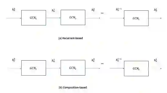 一种共同的实践是将多个图卷积层叠加在一起。根据卷积层叠的不同方法,基于空间的GCN可以进一步分为两类:recurrent-based和composition-based的空间GCN。recurrent-based的方法使用相同的图卷积层来更新隐藏表示,composition-based的方法使用不同的图卷积层来更新隐藏表示。下图说明了这种差异。