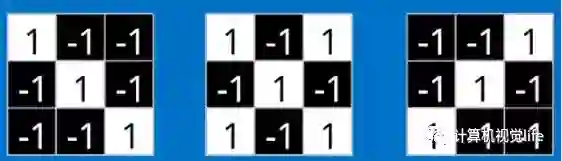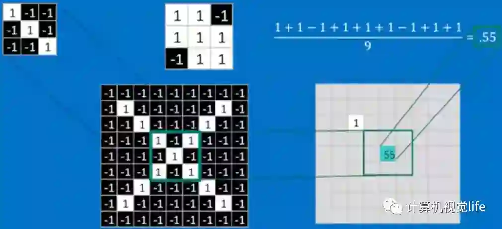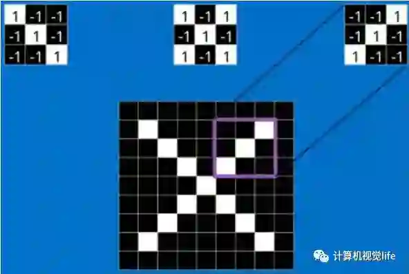如下图所示,像素值"1"代表白色,像素值"-1"代表黑色。对于CNN来说,它是一块一块地来进行比对。它拿来比对的这个“小块”我们称之为Features(特征)。在两幅图中大致相同的位置找到一些粗糙的特征进行匹配,CNN能够更好的看到两幅图的相似性。