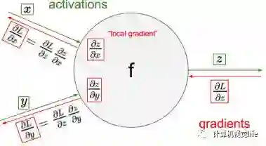 举一个简单例子。绿色箭头代表前向传播,红色代表为反向传播过程,x、y是权重参数,L为误差,L对x、y的导数表示误差L的变化对x、y的影响程度,得到偏导数delta(x)后,x* = x-η*delta(x),其中η为学习率,从而实现权重的更新。