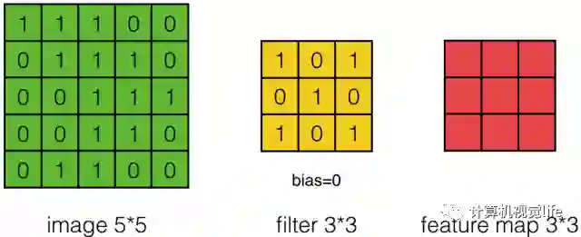 假设有一个5*5的图像,使用一个3*3的卷积核(filter)进行卷积,得到一个3*3的矩阵(其实是Feature Map,后面会讲),如下所示: