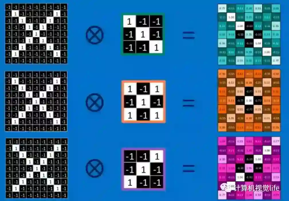 把上面三个小矩阵作为卷积核,就如第一部分结尾介绍的,每一个卷积核可以提取特定的特征,现在给一张新的包含“X”的图像,CNN并不能准确地知道这些features到底要匹配原图的哪些部分,所以它会在原图中每一个可能的位置进行尝试,即使用该卷积核在图像上进行滑动,每滑动一次就进行一次卷积操作,得到一个特征值。仔细想想,是否有一点头目呢?
