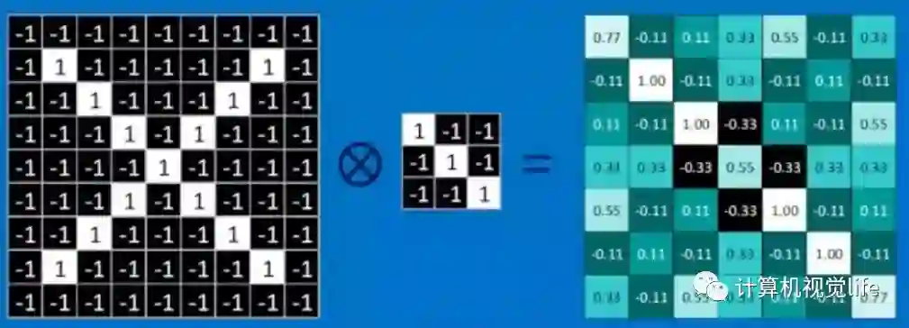 仔细观察,可以发现,其中的值,越接近为1表示对应位置和卷积核代表的特征越接近,越是接近-1,表示对应位置和卷积核代表的反向特征越匹配,而值接近0的表示对应位置没有任何匹配或者说没有什么关联。