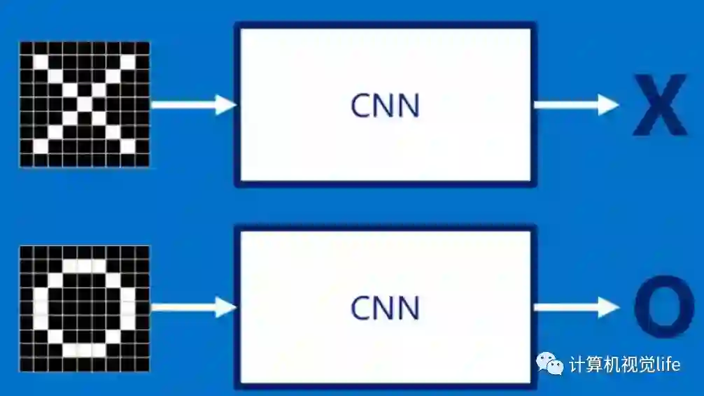在CNN中有这样一个问题,就是每次给你一张图,你需要判断它是否含有"X"或者"O"。并且假设必须两者选其一,不是"X"就是"O"。理想的情况就像下面这个样子: