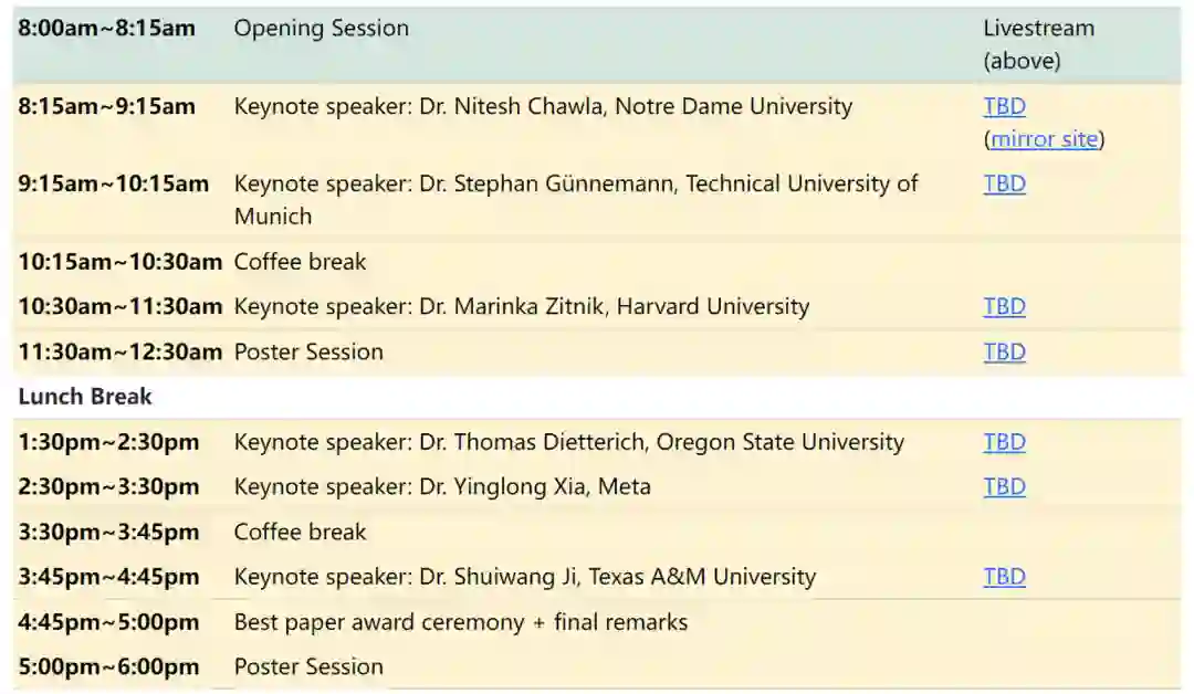 此次可信学习研讨会(TrustLOG)为期一天,旨在将有着不同背景的研究人员和实践人员聚集在一起,共同探讨这些研究问题,并推进图上的可信学习的发展。研讨会将包括关于各种方法和应用的专题演讲、专题海报、特邀演讲和讨论小组。我们欢迎正在进行中的文章、演示文章和展望文章,以及将会进行口头报告和墙报的特邀论文。本次研讨会希望展望和分享用于图可信学习和现实应用上的新理论与新方法。