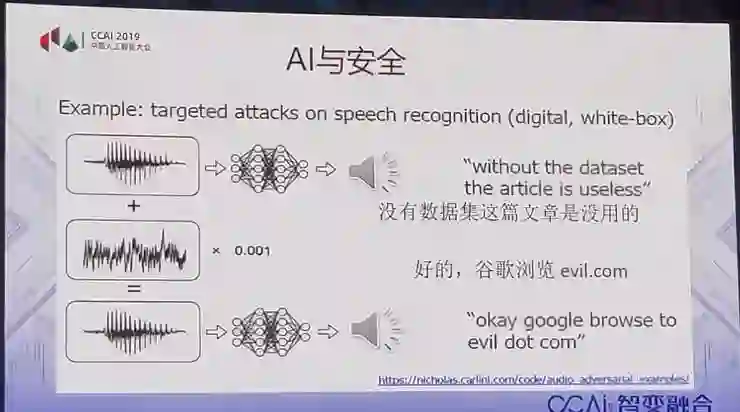 搞军事的人说,过去你语音传过去,它进行干扰,你听不见而已。现在语音传过去,它说进攻,可以让你听成退却,加一点噪声就行了,这就是AI的安全性。