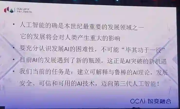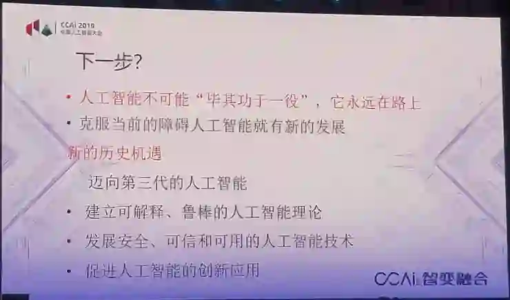 下一步,我们现在有个新的历史机遇,就是迈向第三代人工智能。第三代人工智能就要纠正前面说的两个局限性,建立可解释、鲁棒的人工智能理论,发展安全、可信、可用的人工智能技术,促进人工智能的创新应用。