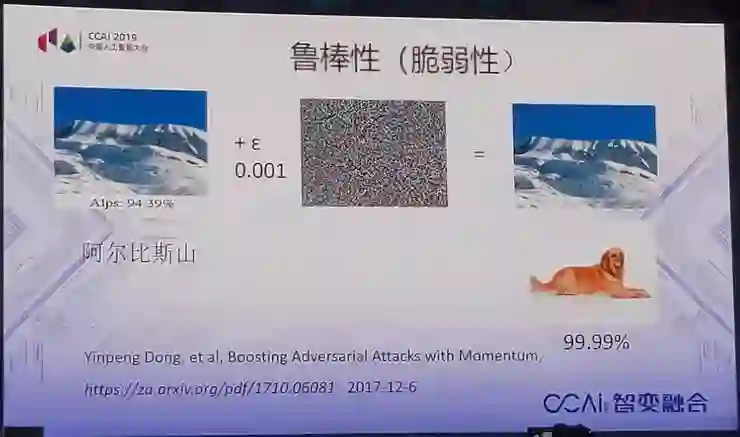 这是阿尔卑斯山图片,人起来是,机器看起来也是,只要给它加上噪声,右边这个图和左边那个图,唯一的区别是噪声多一点,人看起来还是阿尔卑斯山,机器看起来是一条购,而且它的置信度是99.99%,它99.99%认为这是一条狗,非常容易受欺骗,这就说明机器跟人的认知差异非常大。