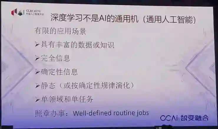 这不能不考虑到人工智能的特点,我们说深度学习根本不是AI的通用机。现在大家在寻找通用的人工智能,到底有没有,还有争论,不去管它,但至少深度学习不是人工智能。这个非常明显,第一代人工智能也好,第二代人工智能也好,它的应用场景必须满足以下五个条件。