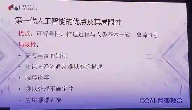 人工智能的第一代模型,有优点,但是也有很大局限性。这个优点是显然的,因为它是模仿人类的,它可解释,鲁棒性很强,但是它的局限性也非常大。因为最大的问题是人类的知识经验,很难准确表达,这就是产生的后来人工智能冬天的根本原因。当时的应用很有限,几乎没有推广,但是,有了大数据以后,这个问题得到了很大改善,特别是机器的能力提高以后,可以把大量的数据作为知识放在机器里,这就是最典型的沃森系统。