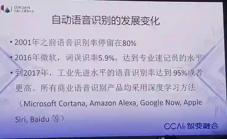 这就带来很大的变化,大家也看到了,语音识别,2001年时它的识别率停留在80%,也就是20%的误识别率;2016年误识率就降到了5.9%,达到专业速记员的水平,到了2017年,所有产品包括谷歌、微软,包括中国的讯飞、百度,用的全是深度学习。