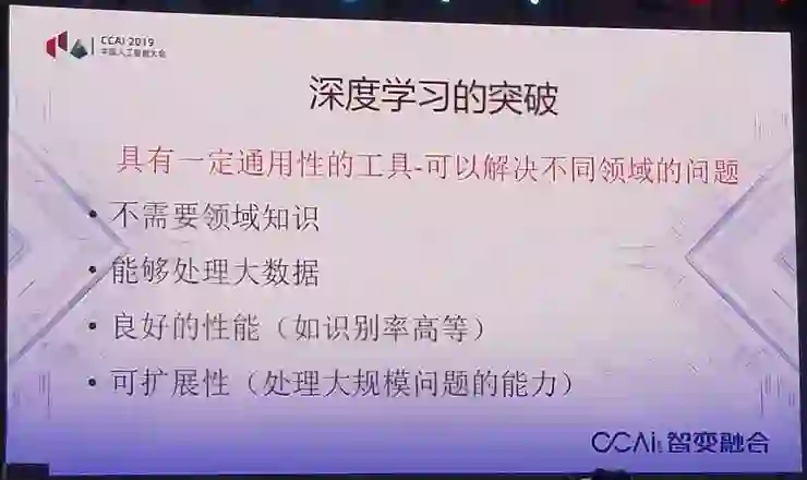 深度学习为什么这么受重视?一个很重要的原因,它有两个重大变化。当网络层次增加以后,有两个重大变化:第一个变化,输入只要原始数据,不需要预处理。第二个是性能提高很多,这就造成了深度学习的重大突破。也就是说,它从一定意义上有通用工具,对领域的知识要求不高,同时能够处理大数据。