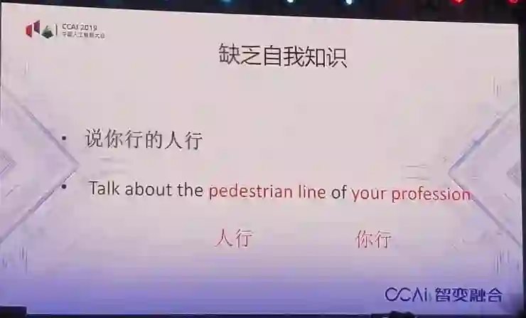 另外,缺少自我知识,这是非常重要的。你说我用这个话,让它翻译,「说你行的人行」,这句话计算机怎么翻呢?「说你专业的人行道」,瞎翻,为什么瞎翻?它不知道自己不知道,没有任何自知之明。这是很危险的。为什么翻译成人行道呢?「人行」,它以为是人行道。为什么翻译成「你的专业」呢?「你行」。这是非常危险的。大家想想,我带了一个翻译,翻译水平挺高的,大多数翻译是很准确的,但是他会瞎说,你敢用吗?人类不会,因为他知道这句话如果没有听明白会再问是什么意思,计算机没有自知之明,人贵有自知之明,这是人类智慧的一个部分。怎么让机器有自知之明?这是很困难的事。
