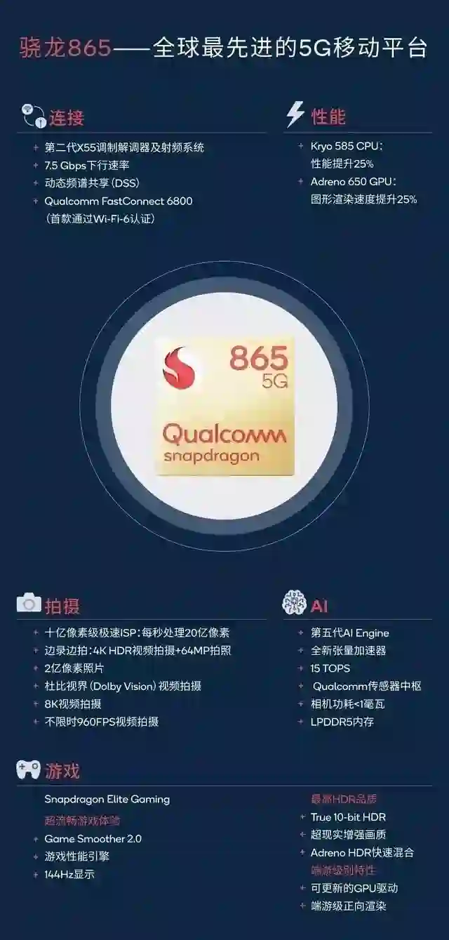 骁龙865依然没有集成基带。高通表示,骁龙865搭载了X55 5G基带,采用了第5代AI引擎,支持了HDR10+,5G网络方面则是支持mmWave毫米波,Sub-6 GHz, CA, DSS, 独立和非独立组网。高通骁龙865的AI性能达到了15 TOPS,是上代的两倍,支持 8K30 帧或者是64MP 4K视频拍摄,最高支持200 MP的相机。