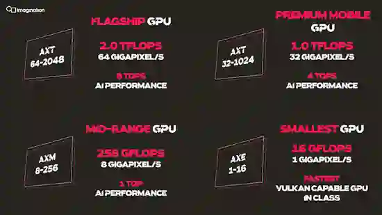 IMG A系列在相同的时钟和半导体工艺上,比正在出货的PowerVR设备性能提高了2.5倍,机器学习处理速度提高了8倍,且功耗降低了60%。据称,与当前可用的其它GPU IP相比,IMG A在性能、功耗、带宽和面积上都有优化,并且具有包括确保50%的图像压缩数据等特异性优势。