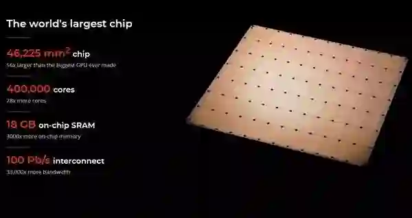芯片面积最大:尺寸约20厘米×23厘米,总面积46,225平方毫米。面积和一块晶圆差不多。