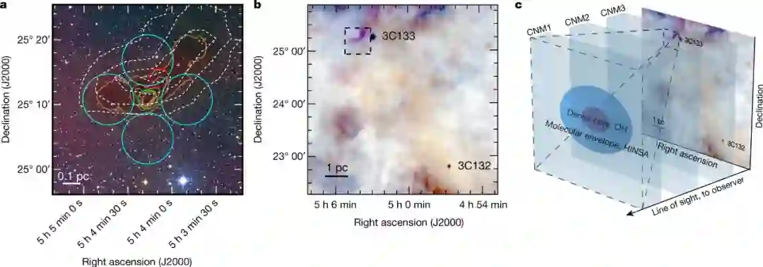研究者开发了一种叫做 HI 窄自吸收(HI narrow self-absorption, HINSA)的技术,以提供从 HI 到 H_2 转变的探针。HINSA 追踪与 H_2 混合良好的冷原子氢,并通过碰撞提供必要的 H1 冷却(CNM 中无法提供)。