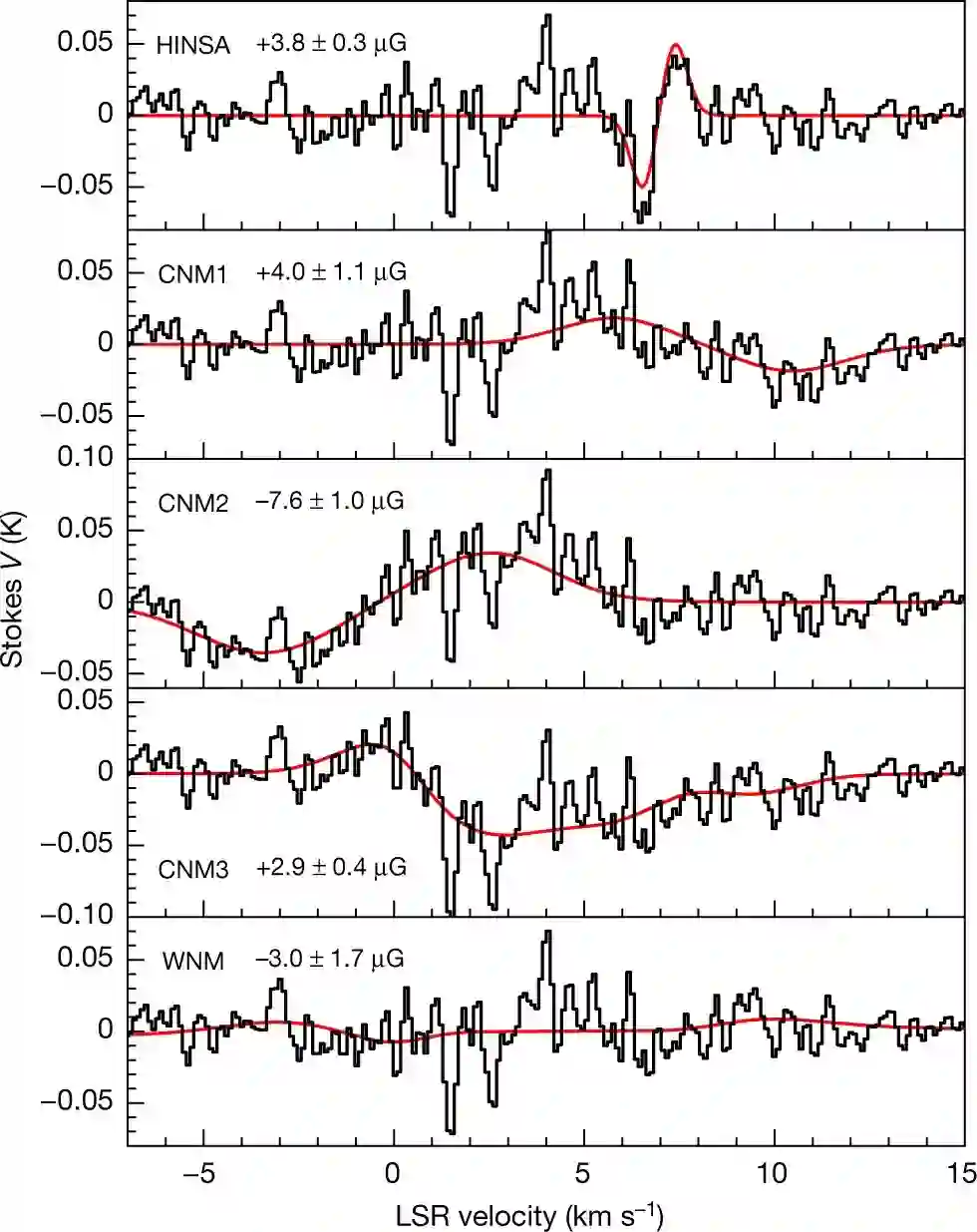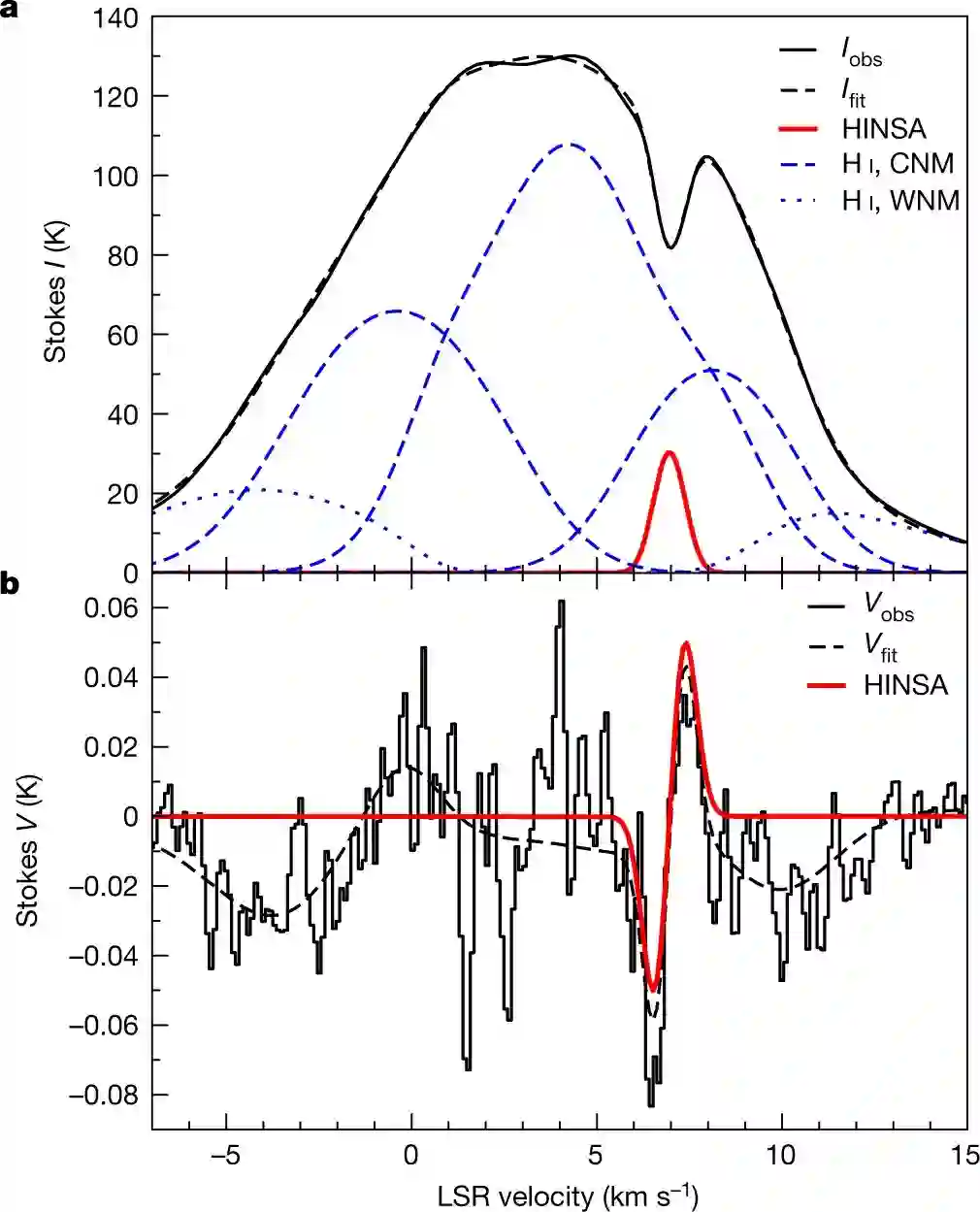 下图 2 展示了 Stokes I(v) 和 V(v) 参数的频谱,v 表示速度。图 2a 将 I(v) 分解为前景 HINSA 分量(component)、背景 WNM 分量以及 HINSA 和 WNM 之间的 3 个 CNM 分量。图 2b 为 HINSA 的塞曼分裂和 5 个分量的总体塞曼分布。