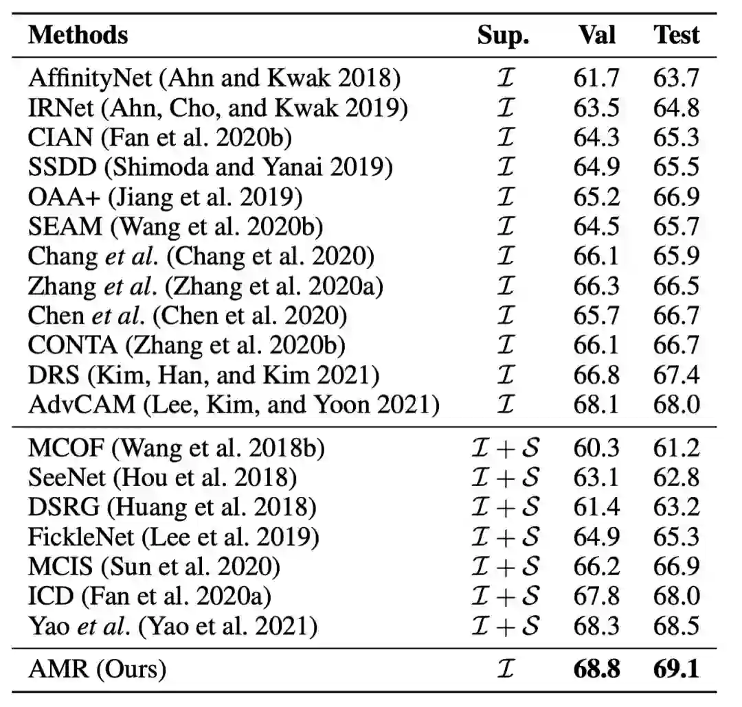 为了解决上述问题,字节跳动 - 智能创作团队提出了一种即插即用的激活值调制和重校准(AMR)模块来生成面向分割任务的 CAM,大量的实验表明,AMR 不仅在 PASCAL VOC 2012 数据集上获得最先进的性能。实验表明,AMR 是即插即用的,可以作为其他先进方法的子模块来提高性能。论文已入选机器学习顶级论文 AAAI2022,相关代码即将开源。