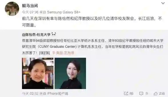 今日凌晨,杜克大学电子与计算机工程系陈怡然教授发布朋友圈,对两位清华系女教授表达祝贺。