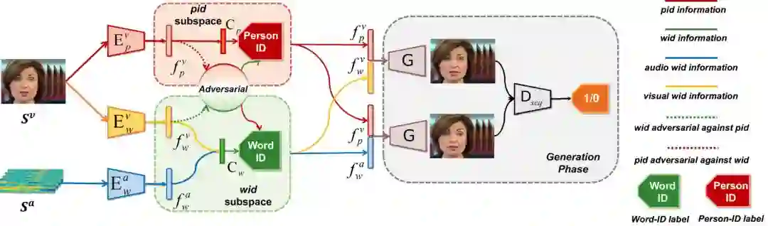 ;通过网络,人脸空间被划分成 wid 和 pid 两个互斥的空间,并使用对抗训练的方式解离开。同时 wid 空间是音频和视频协同映射的联合空间,通过同步两个空间的信息,要求对应的音频和视频映射到空间的同一位置。