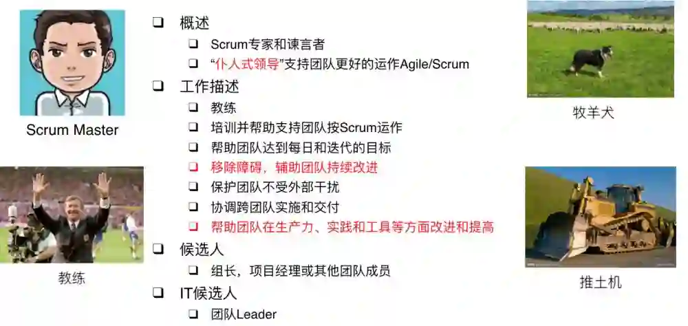 Product Owner:主要负责确定产品的功能和达到要求的标准,指定软件的发布日期和交付的内容,同时有权力接受或拒绝开发团队的工作成果。 作为产品负责人,PO清楚地知道产品的愿景,需要对产品待办列表的梳理、优化、优先级排序等负责。PO决定Why和What,一般可以对应为我们理解的产品经理和业务分析师的角色。