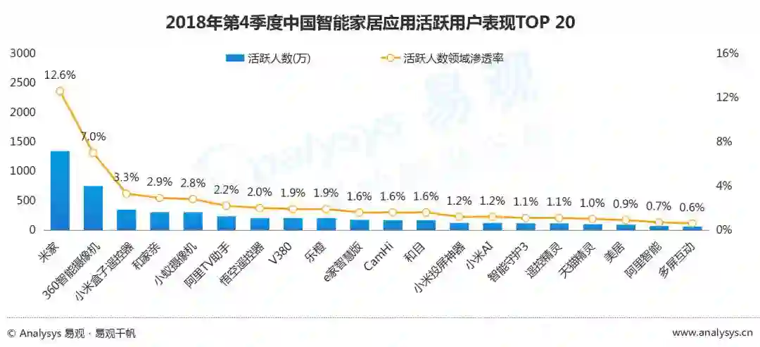 米家、360智能摄像头、小米盒子遥控器、和家亲和小蚁摄像机在2018年第四季度用户活跃人数最多,其中米家遥遥领先其他厂商。