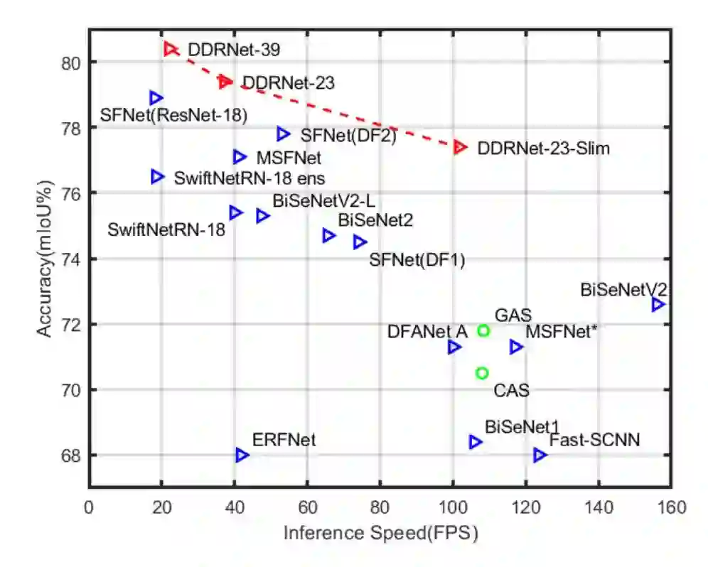 上图是来自Deep Dual-resolution Networks for Real-time and Accurate Semantic Segmentation of Road Scenes,该图描述了当前实时语义分割的一些优秀算法。从上图可以看出,DDRNet算法在速度和精度上都是较为优秀的算法。选择DDRNet-23-slim算法来作为Baseline。DDRNet的具体代码可以参考GitHub(本文采用该代码)。