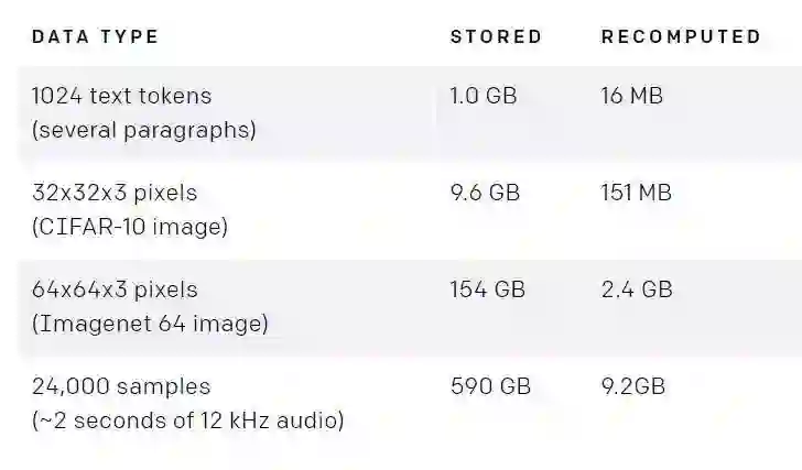 应对这个问题的一种做法是在反向传播中根据建立的检查点重新计算注意力矩阵,这是深度学习中的一种常见做法,可以用消耗更多计算为代价减小内存的使用。对 Transformer 模型中的注意力矩阵使用这种做法之后,它的效果是让最大的内存消耗不再和网络的层数相关,就让训练比以往深得多的模型变得可能。在实际尝试中,OpenAI 的研究人员们训练了最深达 128 层的 Transformer,也在 CIFAR-10 之类的测试任务中击败了较浅的模型。