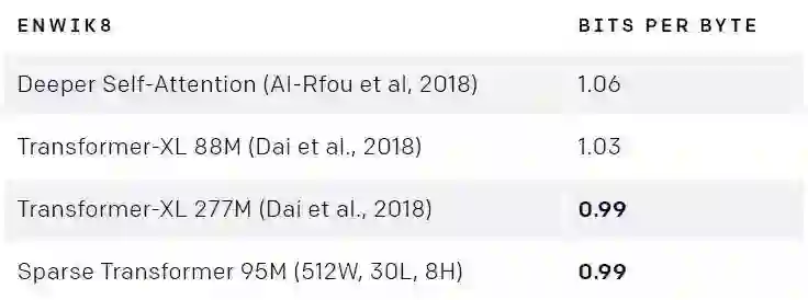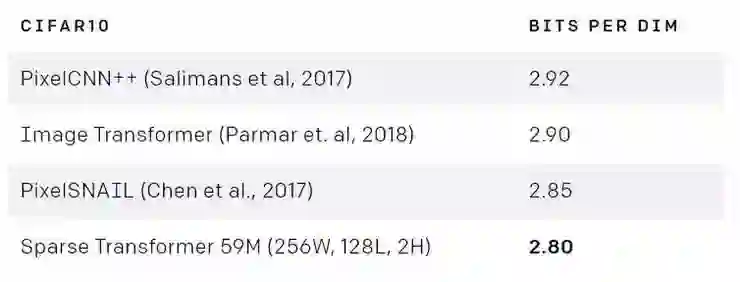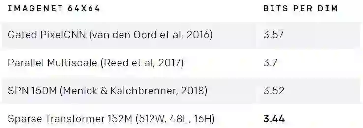 稀疏 Transformers 模型在 CIFAR-10、Enwik8、Imagenet 64 数据集上的密集估计任务中取得了目前的最好成绩。