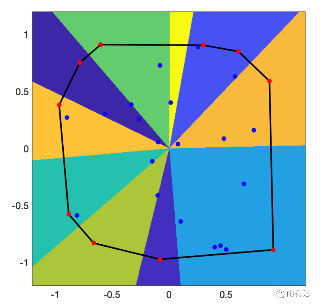 然后,大家在上一部分的内积的沃罗诺伊块的图上,会发现,ip-Delaunay上所使用的点是距离原点比较远的那一批,因而,在经过这个变换后,这些点都变成了距离原点比较近的那一批。