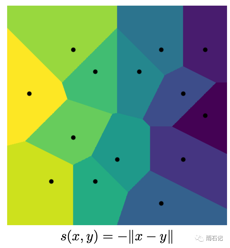 图中每一个不同颜色的块都是对应起区域内黑点的沃罗诺伊块。距离计算公式是-||x - y||。可以注意到相邻的两个块之间的分界线一般是对应的两个点的连线的中垂线。