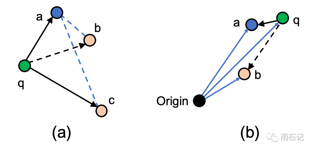 但是在ip-Delaunay中,这样的策略就不适用。因为,虽然dis(q, b) > dis(a, b),但是对于大部分的q'来说,dis(q', a) > dis(q', b),意味着b这个点可有可无,因而需要判断的条件是dis(b, b) > dis(a, b)。