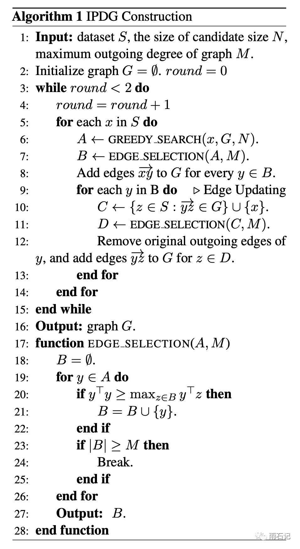 另外一个可以改进的地方是极点,因为极点是ip-Delaunay的骨干和精髓,所以极点上的边应该多一些,但是使用贪心策略构建德劳内图的时候,边多的点不是极点而是先加入的点。这就会导致变差了。所以提出了一种循环更新法,即在构建好Delaunay图之后,对于每个点,再重新更新一遍邻居节点。
