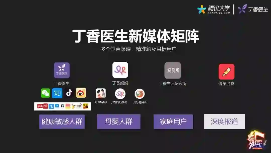 面向不同的细分领域、细分用户与细分圈层,丁香医生构建了一个新媒体矩阵,每一个公号分别对应不同的人群和需求。到目前为止,丁香园、丁香医生、丁香妈妈、丁香生活研究所、偶尔治愈等这些你能看到的公众号,你都可以去关注。