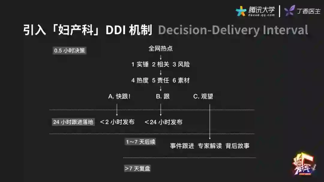 所谓的快,其实就是借势营销。资讯曝光了,热点出来了,跟还是不跟?怎么跟?半小时内能做决策吗?两小时内能保证上线吗?丁香医生有一套完整的流程术:DDL机制,保证在规定的时间内,丁香医生能够去跟进热点,及时做出反应。