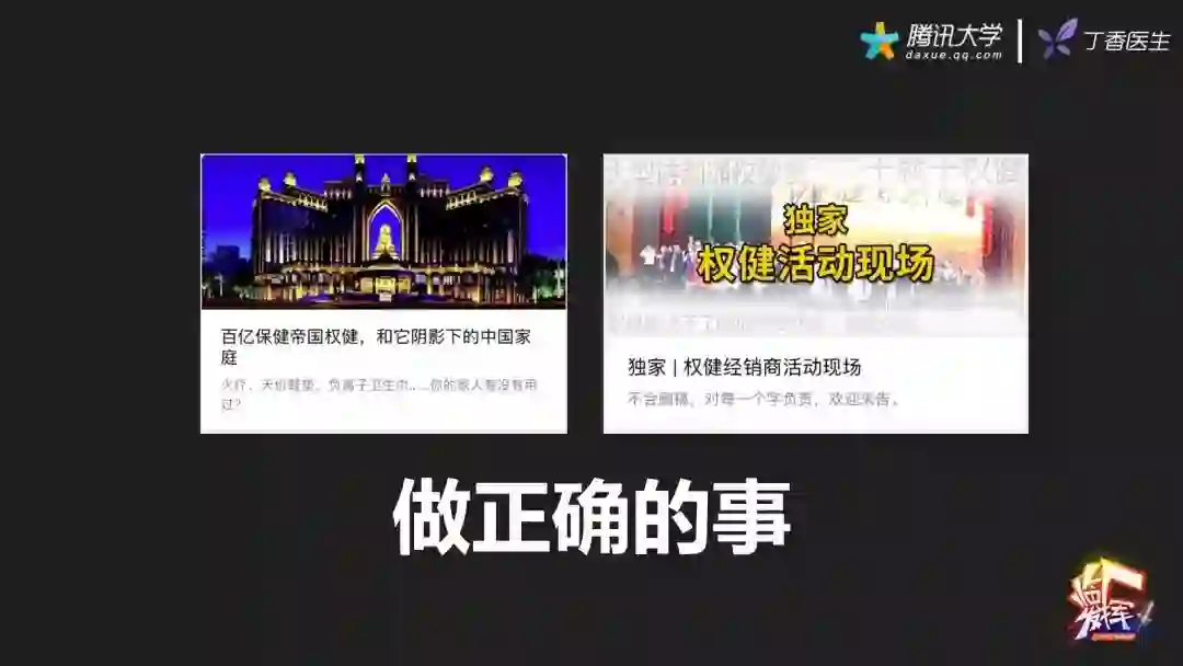 所以当团队讨论这个选题时,也有过纠结和犹豫,但为什么仍坚持做了?初洋坦言,丁香医生之所以敢于揭露权健的黑幕,其背后是价值驱动的,因为丁香医生始终坚持:做正确的事情。“道之所在,虽千万人吾往矣”基于这样的信念,丁香医生做了曝光权健这件事情。