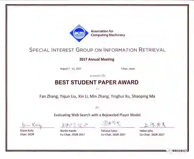 8月9日,在日本东京举行的ACM SIGIR 2017会议上,张帆(导师:刘奕群)为第一作者的论文“Evaluating Web Search with a Bejeweled Player Model”(作者:张帆、刘奕群、李昕、徐盈辉、张敏、马少平)获得唯一的最佳学生论文奖。